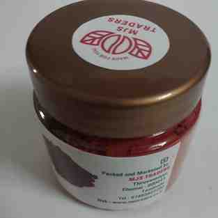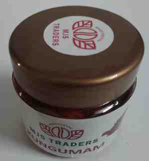 Kungumam is a bright red or vermilion-coloured powder made primarily from turmeric powder mixed with slaked lime (calcium hydroxide), which chemically changes the colour to deep red.